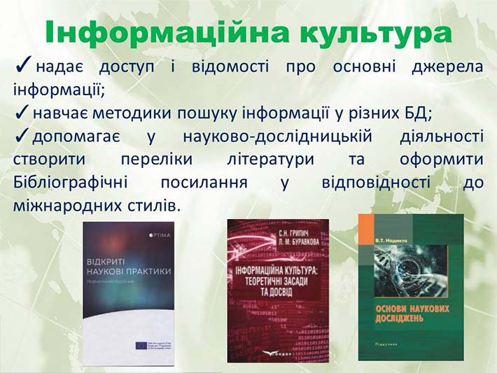 До кожної лекції було підготовлено презентації з демонстрацією фондових колекцій, структури та широкого спектру послуг і можливостей, що надає бібліотека своїм користувачам. Учасникам освітнього процесу надали інформацію про освітні ресурси та бази даних, доступ до яких може надати бібліотека і які можна використовувати для якісного виконання навчальних завдань. Увагу приділяли також питанням інформаційної культури та академічної доброчесності. Особливо наголошували на тому, що саме бібліотека забезпечує доступ до достовірних першоджерел та перевіряє посилання в наукових роботах згідно з національними та міжнародними стандартами. Сподіваємось, що ці зустрічі були корисними для всіх учасників, а студенти отримали вичерпну інформацію, що стане їм у нагоді в процесі навчання. Дякуємо викладачам Віктору Грушці та Тетяні Легостаєвій, що запросили бібліотеку до участі у лекціях, сподіваємось, що такі зустрічі стануть традиційними для студентів усіх факультетів.